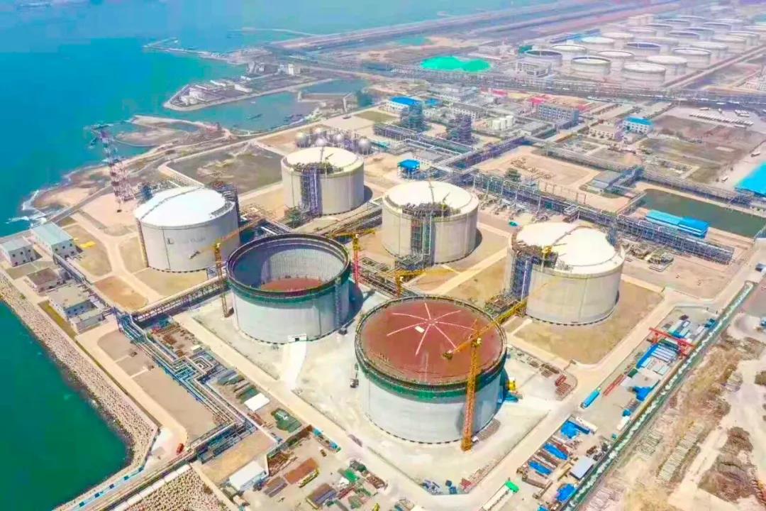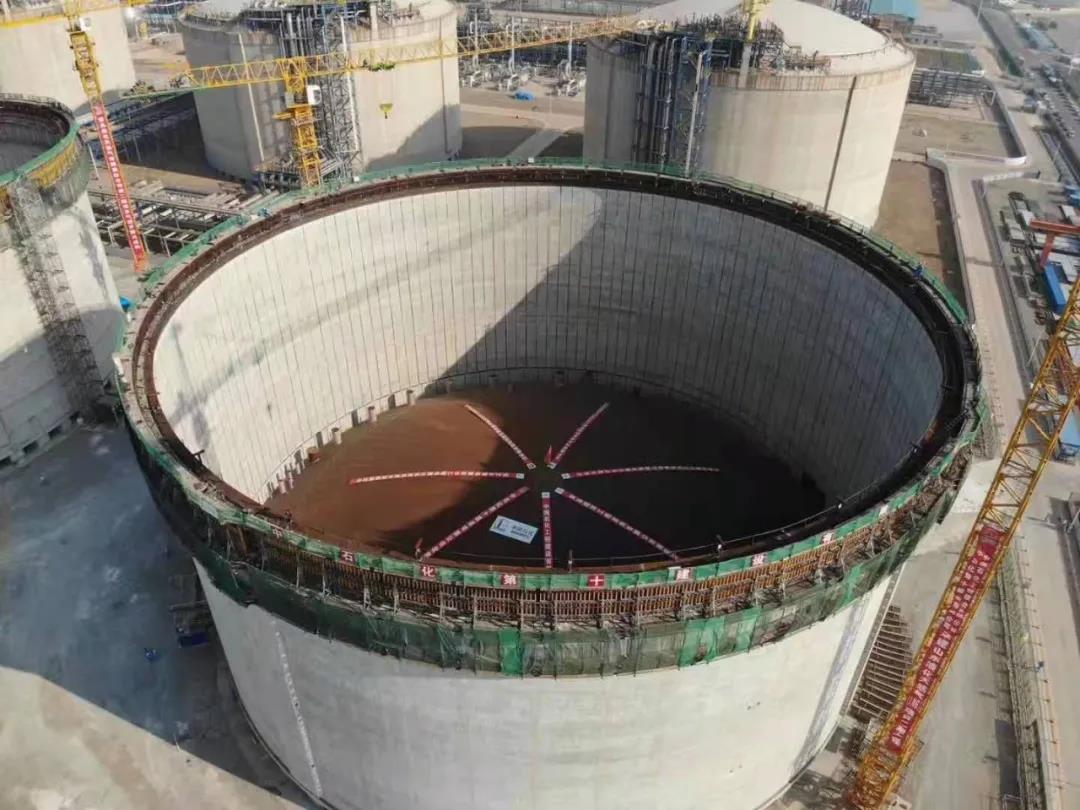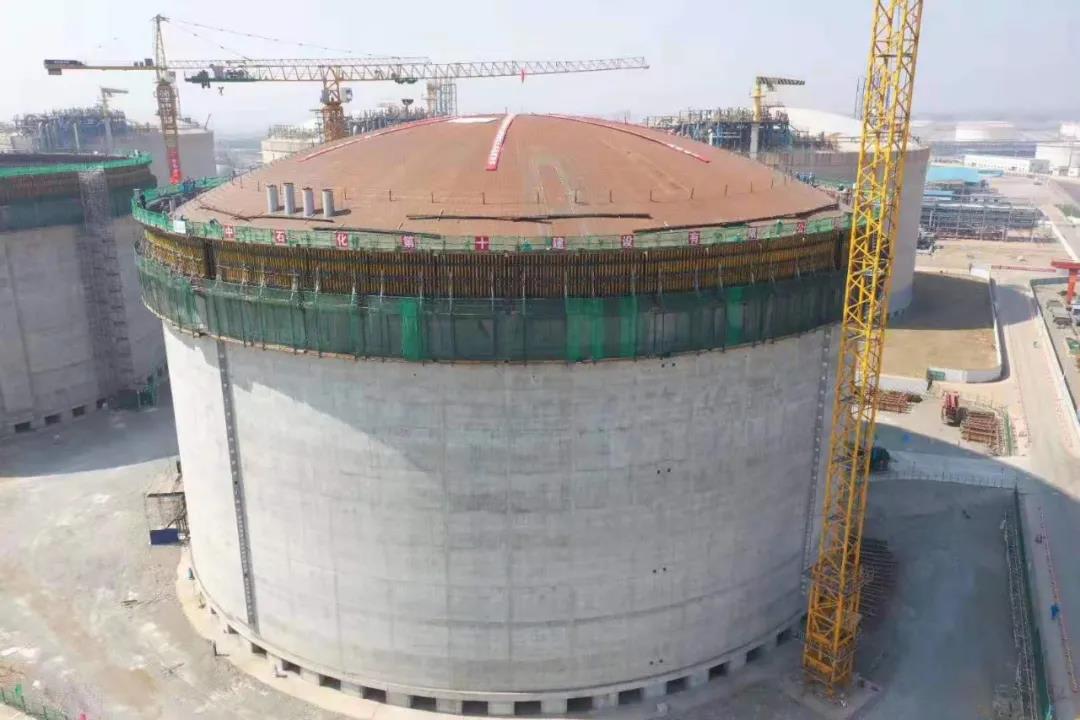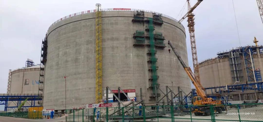 在青岛市黄岛区董家口嘴, 中石化山东液化天然气(LNG)项目二期工程正在如火如荼的建设中。项目内容为新增2台16万立方米LNG储罐及配套设施,总投资约23亿元,建设周期为3年,建成后LNG接卸能力将由300万吨/年提高至700万吨/年,将大力推进中国石化天然气产供储销体系建设,进一步缓解华北地区冬季用气荒、促进环渤海湾LNG接收站合理布局。中化华油建设集团目前正在进行该项目二期工程5号储罐及管道的保冷施工工作。