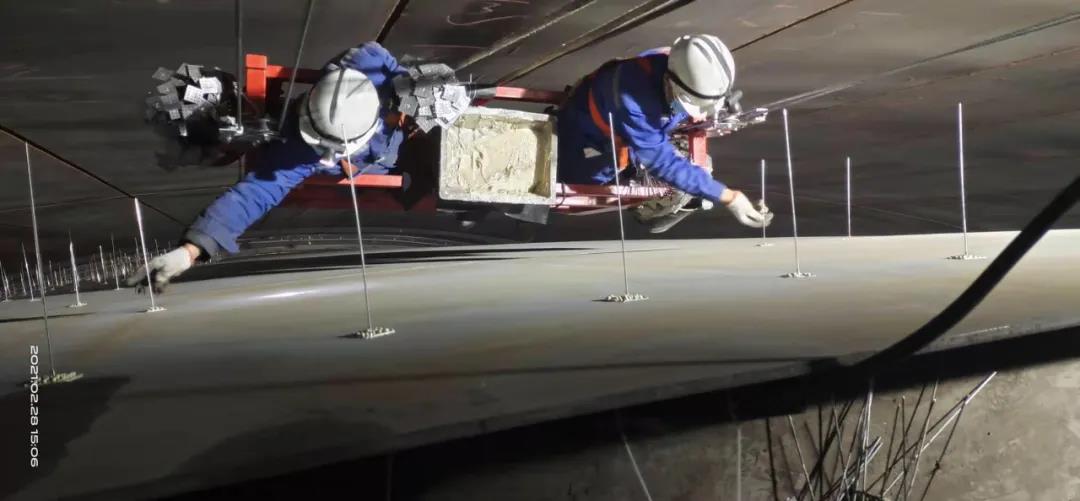 罐壁弹性毡施工分为1.保冷钉粘结 2.贴弹性毡 3.贴密封挡墙布 ,所有作业都是在狭小的电动吊蓝上完成的,吊蓝长2米,高1.5米,宽0.6米,(净空间宽只有0.4米),仅供两个工人刚好站下 。作业人员在狭小的吊蓝里一干就是四-五个小时,这对工人的身体素质是个极大考验,既要有灵活的身手还要有良好的体力和毅力,这点恐怕连“蜘蛛侠”也要汗颜了呢!