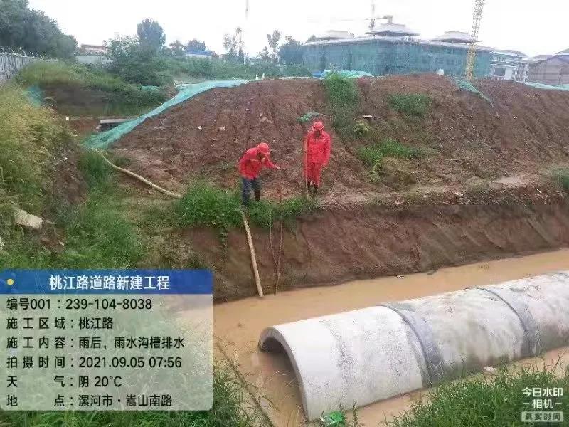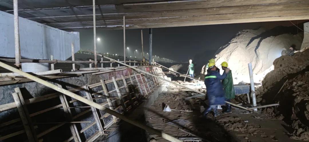 夜间雨后,工人师傅们加紧组织混凝土浇筑