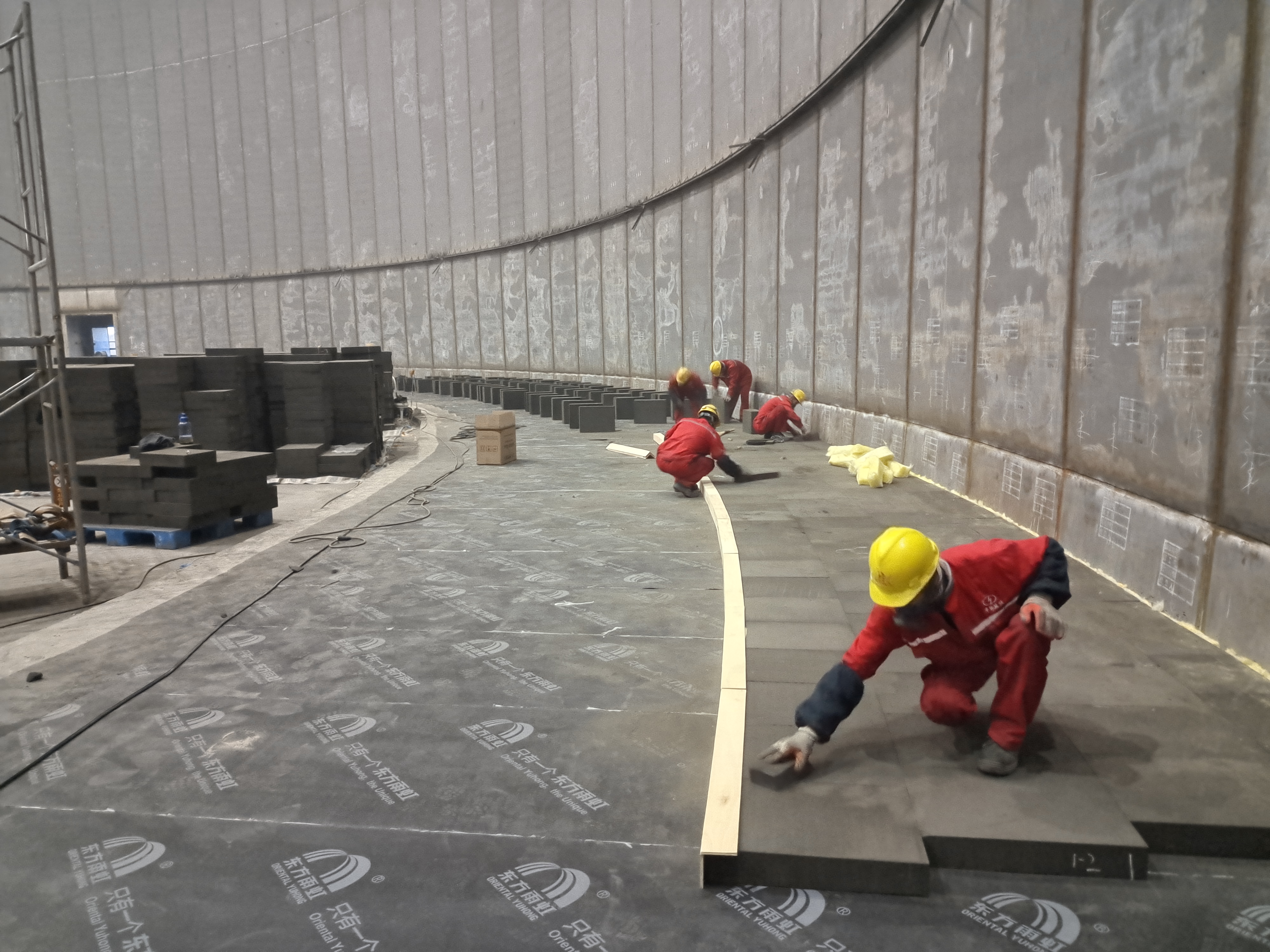 为确保储罐保冷“百日攻坚”计划顺利进行,如期完成节点目标,华油集团龙口项目部精心组织策划、科学调配人员、合理统筹资源、优化施工工序、严格管控质量,在保证安全的前提下,以严谨的工作作风推进项目建设。目前2-3#号罐罐底环梁下和环梁两侧的玻璃砖施工正在有条不紊地建设中。